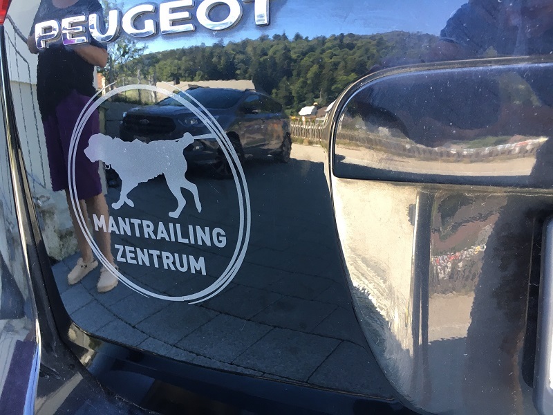 Auf dem Rückweg vom Trail kreuzte Bosco, der Hund von Claudia das Auto mit der Beschriftung und bellte den "übergrossen" Charly an.Aufkleber Mantrailing - Zentrum