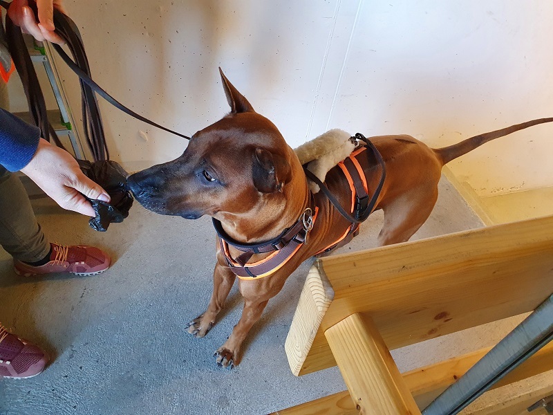 "Ohne Erwartungen an Ace, unseren Thai Rüde nahmen wir als junges Team am Seminar Indoor-Trailen teil. Voller Spannung nach dem coolen Theorieteil gingen wir auf den ersten Trail. Ace machte das wie ein Profi und ich platzte fast aus Stolz. Vielen Dank an das tolle Mantrailing Zentrum Team. Wir kommen wieder..... :-)", Bettina mit Thai Ridgeback Ace