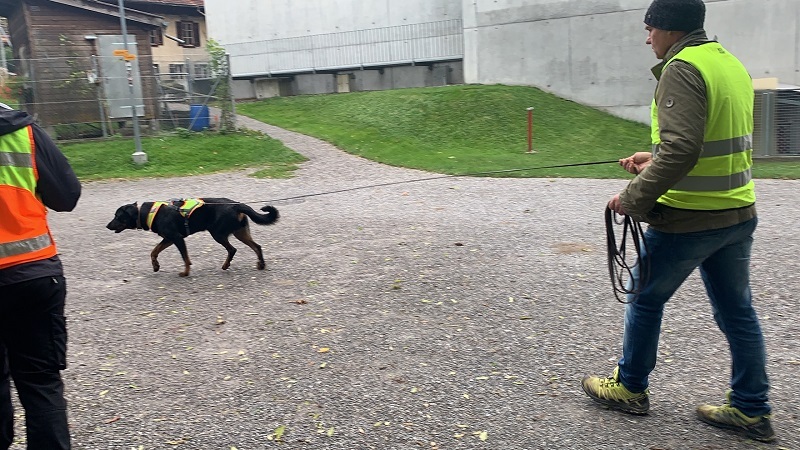 Die Berger des Pyrénées Hündin Hearsay startet mit viel Eifer und kommt spursicher ans Ziel. Beavy, die arbeitsfreudige Labradorhündin prüfte erst die “Kunst-Kuh” vor der Gemeindeverwaltung kritisch, arbeitete super weiter und fand die versteckte Person auf einer Gittertreppe.