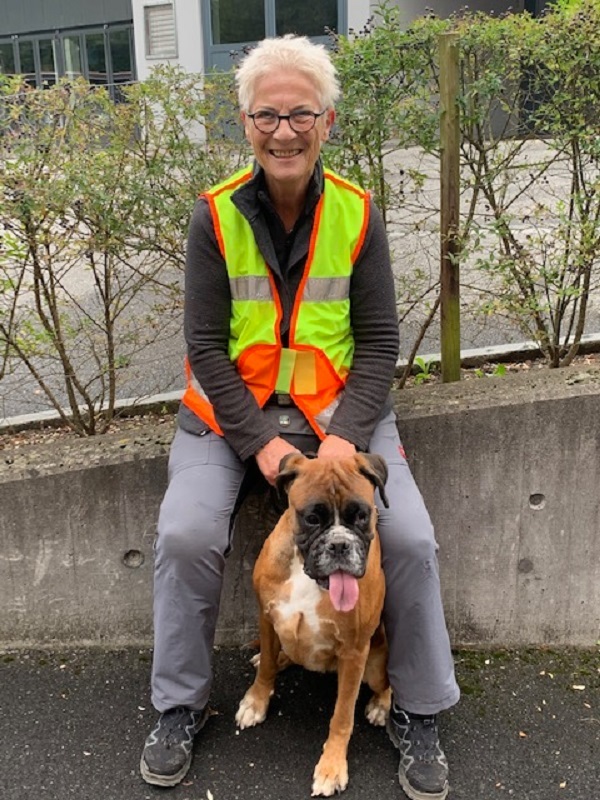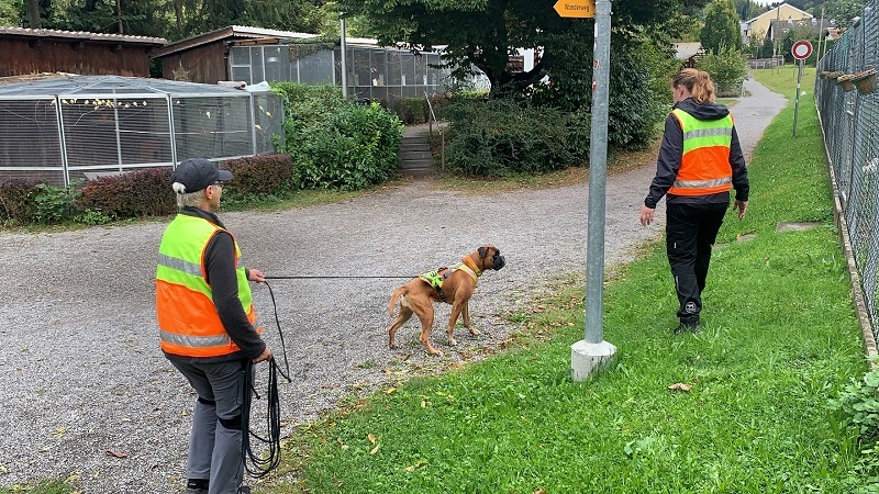 Als zusätzliche Herausforderung trailte die Boxerhündin Rooney auf dem öffentlichen Weg durch die Kleintieranlage und reagierte sehr stark auf die Hühner. Mit konsequenter Führung meisterte das Team diese Passage super und fand rasch ans Ziel.