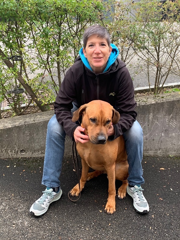 Während dem ersten Trail setzte Regen ein und der Rhodesian Ridgeback Chuma suchte sich umgehend ein Dach über dem Kopf. Herrlich haben die Hunde auch so viel Humor wie die aufgestellten Menschen an diesem Seminar. Die Hundeführerin überzeugte Chuma mit der Kreuzungsarbeit weiter zu machen und fand zielgerichtet die versteckte Person.